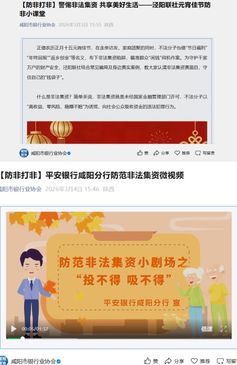 创新宣传载体,构建立体格局。在巩固线下阵地的同时,各机构积极拓展线上渠道。平安银行咸阳分行、恒丰银行咸阳分行组织推广《投不得,吸不得》《我在霸总剧里当银行客户经理》等自制防非短视频。陕西泾阳泰隆村镇银行创新编制《防范非法集资典型案例库》,系统拆解“养老投资、保本高息、消费返利”等高发骗局套路,提升宣传深度。泾阳联社结合节日发布“防非小课堂”,以“春节解债”“养老返利”“返乡创业”等节期高发骗局真实案例进行警示。